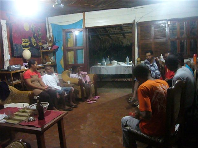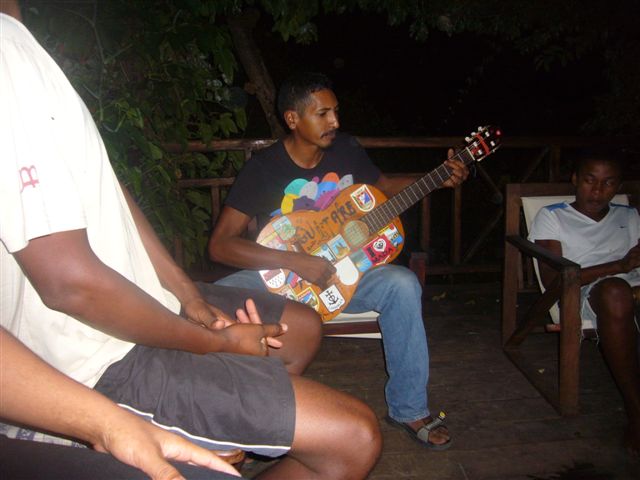 Ho detto loro che sarebbe stata una buona idea anche per il Turismo solidale, organizzare, ogni sabato, una serata malgascia. Hanno subito accettato con entusiasmo. Mi hanno allora proposto di comprare gli strumenti necessari al "nuovo gruppo", cosa difficile da trovare qui, ma loro stessi, un poco alla volta, li hanno trovati. Abbiamo così comprato una chitarra un pò vecchiotta, non tanto buona, secondo me, ma era l’unica disponibile, un valhia nuovo, (un grosso bambù con corde che dà un suono come quello dell’arpa), un djembé (come un tamburo, ma tutti lo conoscete certamente) e quello della "pioggia". Ogni sabato sera, preparo una bella cena per tutti, siamo una quindicina, ( credo che sia la cosa più apprezzata) e poi... si canta e si fa musica! Li osservo mentre suonano, bravi, concentrati e fieri... sorridono fra di loro ...c’è una grande intesa, è la loro musica, che ben conoscono, contenti di potersi riunire così, esprimendo se stessi, la loro "cultura", le loro abitudini e passioni, le loro capacità, (che in quale occasione possono esprimere?). Sempre "soli", ognuno chiuso nella sua casa-capanna, anche se con la propria famiglia, senza mai un incontro con gli altri, se non di lavoro. Pensate che l’ultimo che è arrivato, suona benissimo il djembé, viene dalla città dove abita, Hell –Ville. Quando me l’hanno presentato mi ha detto, sorridendo " Ma io ti conosco bene, sono quello che ha la bancarella fuori del carcere." Chiaramente non mi ricordavo di lui. E’ veramente bravo, per la passione per la musica, viene ogni sabato dalla città (io gli dò i soldi per il taxi del ritorno) e credo che sia il più bravo del gruppo! Sabato scorso abbiamo cenato e suonato a casa mia, e c’erano anche gli ospiti del turismo solidale, che hanno apprezzato tantissimo la serata, trovandoli tutti bravissimi. Grandi applausi alla fine di ogni pezzo! Adrien è rinato e sorride felice alla chitarra, anche se sempre concentratissimo!